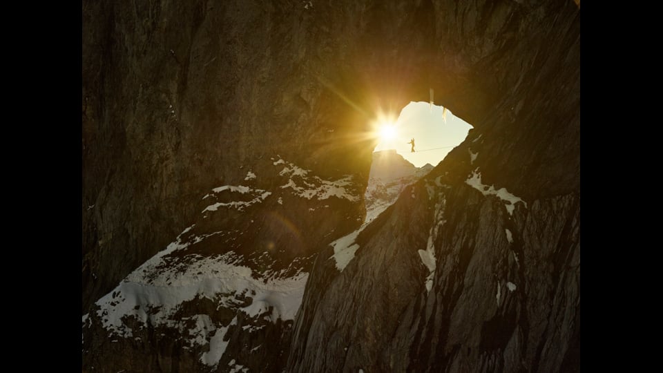 Stephan Siegrist chose to portray the magical natural phenomenon in the "Martinsloch" symbolically on the highline. The phenomenon is only visible twice a year.