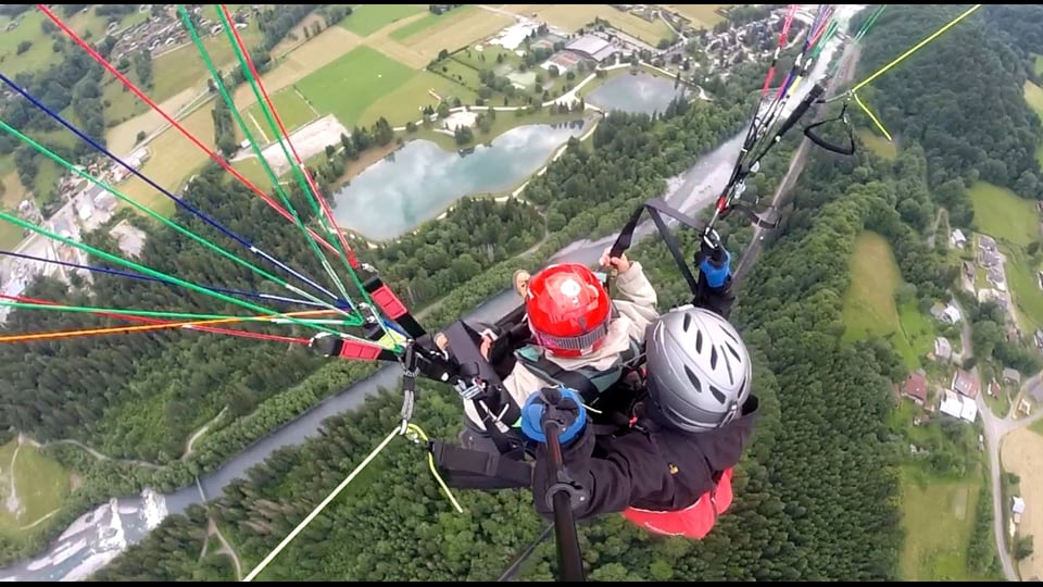 Vol biplace par Adrien, Pilote, avec Raph 8 ans, et Bastien 10 ans, à Samoëns. Leur premier vol en parapente biplace.